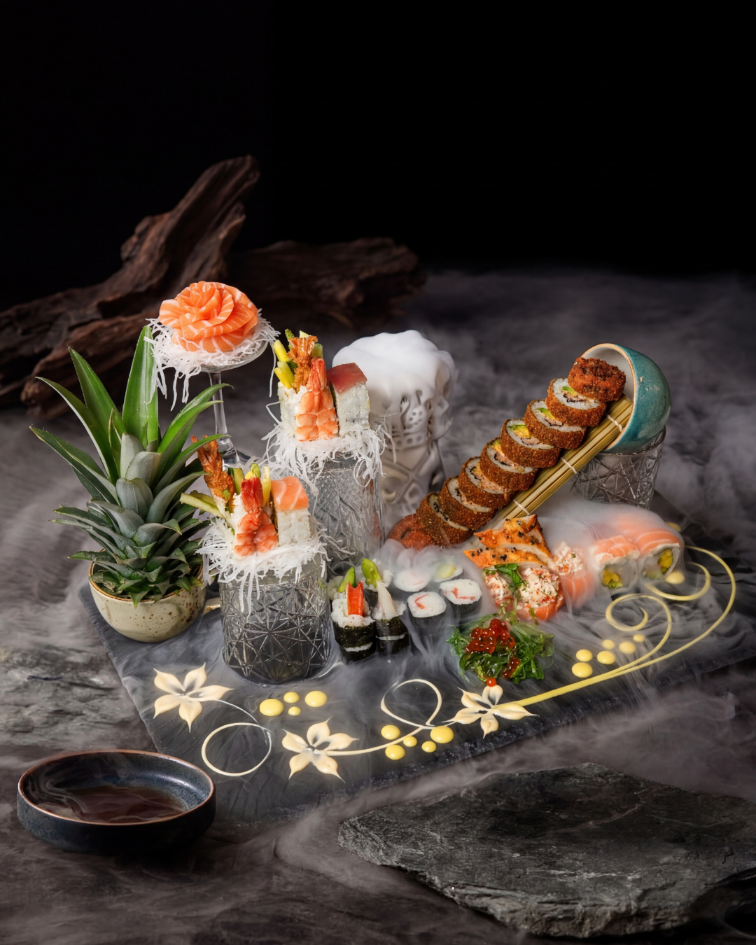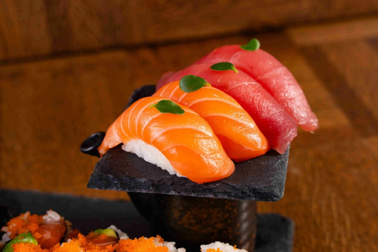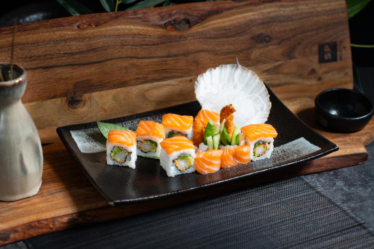 Mit Garnelen, Avocado, Fischrogen und Philadelphia, ummantelt mit Lachs und Thunfisch.