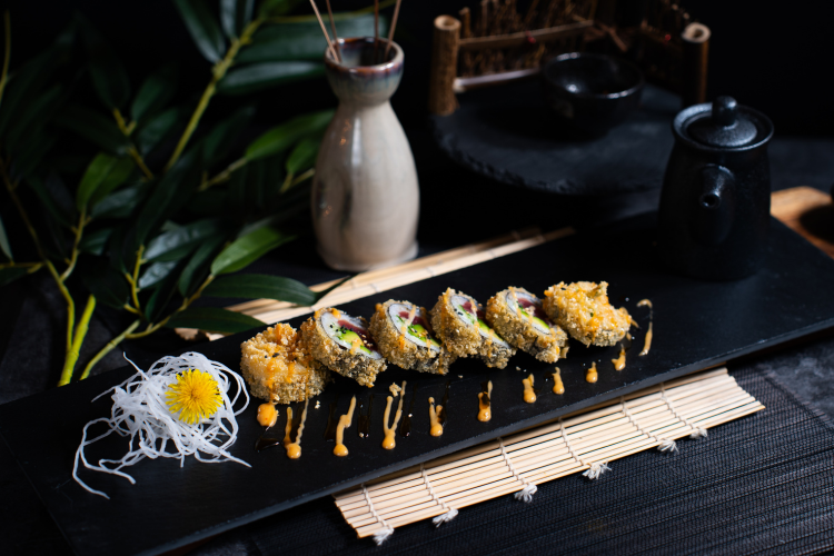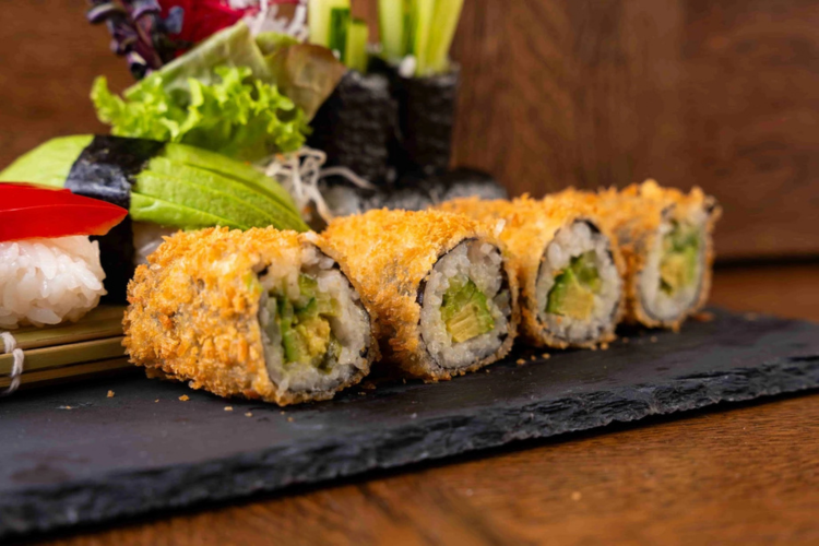 Knusprig gebackene Rolle mit Garnele, Avocado, Gurke und Mango-Sauce.