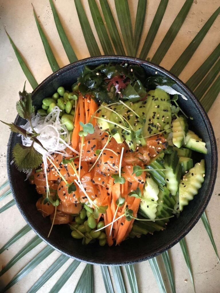 Mit Lachs, Chicken oder Thunfisch, wahlweise roh oder frittiert, dazu Kimchi, Salat und Gurke.